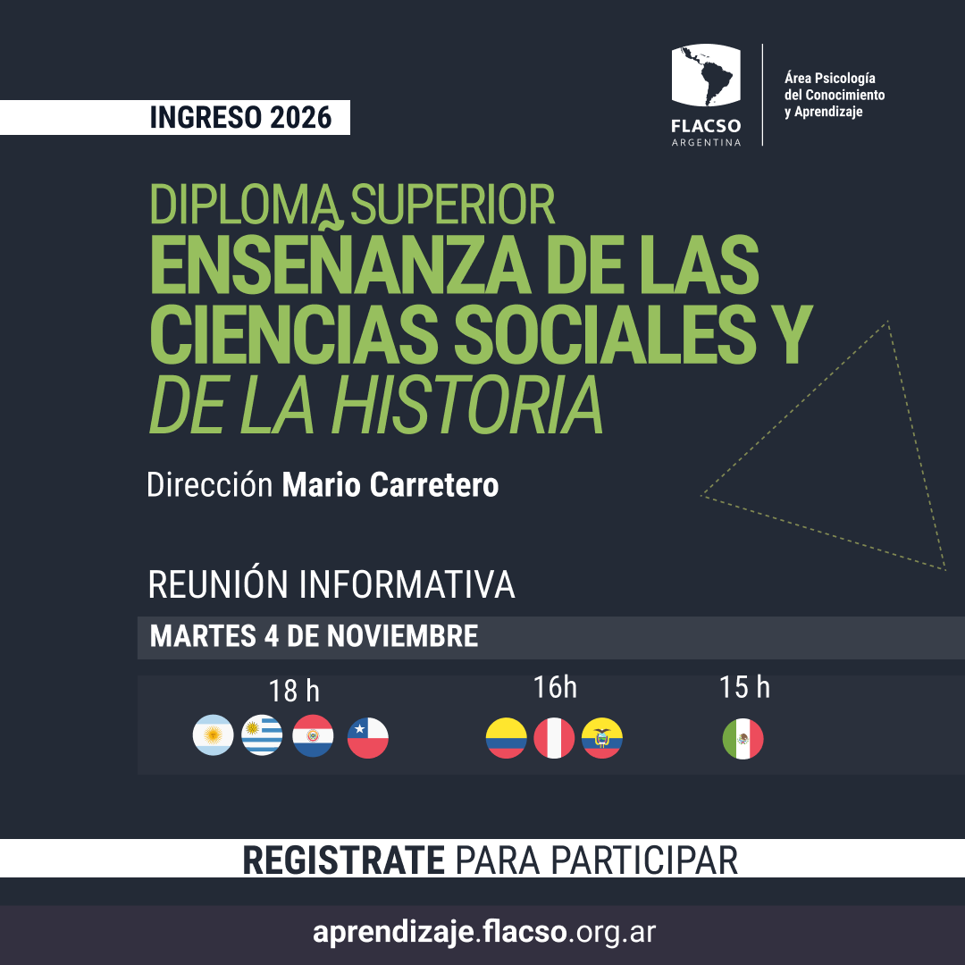 Te invitamos a sumarte a la reunión informativa del Diploma Superior en Enseñanza de las Ciencias Sociales y de la Historia donde podrás conocer todos los detalles del diploma y asegurar tu vacante para cursarlo en el 2026.